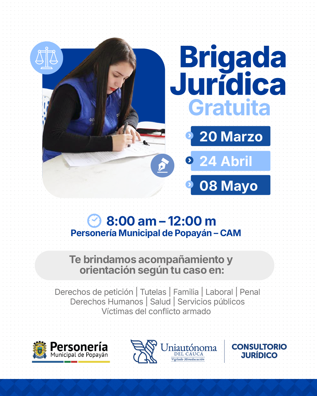 Capacitación – Guía práctica para futuros investigadores Detalles Fecha inicio: 20/Mar/2026 Fecha fin: 20/Mar/2026 Hora inicio: 08:00 Hora fin: 12:00 Lugar: Personería Municipal de Popayán – CAM Contacto CONSULTORIO JURÍDICO Ir a Whatsapp Descripcion